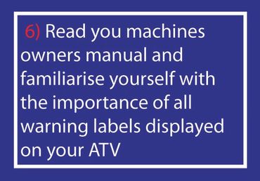 An inspection of your ATV before each ride is essential because the off-road environment can be harsh on vehicles. An inspection can minimise the chance of accidents, ensures long-term enjoyment of your ATV, and should only take five to 10 minutes depending on your ATV. Your owner’s manual will show you what equipment to check on your particular machine, and EASI offers this basic T-CLOC checklist as well. T-CLOC stands for Tyres and Wheels, Controls and Cables, Lights and Electrics, Oil and Fuel, Chain/Driveshaft and Chassis.